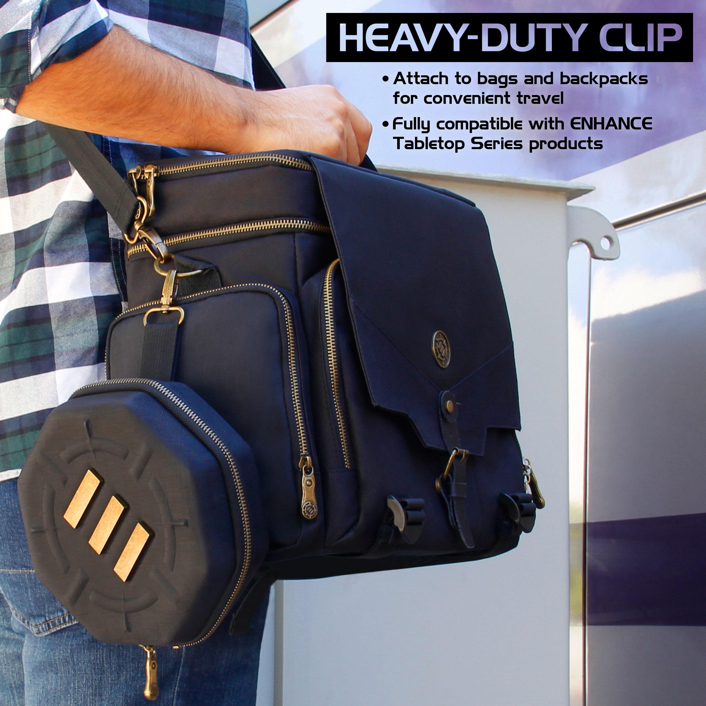 Your metal dice and unique dice sets will find a permanent and protective home within the ENHANCE Dice Storage Vault. It also features a metal attachment clip for attaching to backpacks and bags, which is fully designed to work with the ENHANCE Adventurer's Bag, the ENHANCE Miniature Figure Carrying Case, and the ENHANCE MTG Card Carrying Case. Our Dice Travel Case is great for Dungeons and Dragons, board games, and various other tabletop RPG games including Pathfinder, Runequest, GURPS, Savage Worlds, and many more. Replace your small dnd dice bags and bulky dice trays with the ENHANCE Dice Case, a solution for all RPG players.