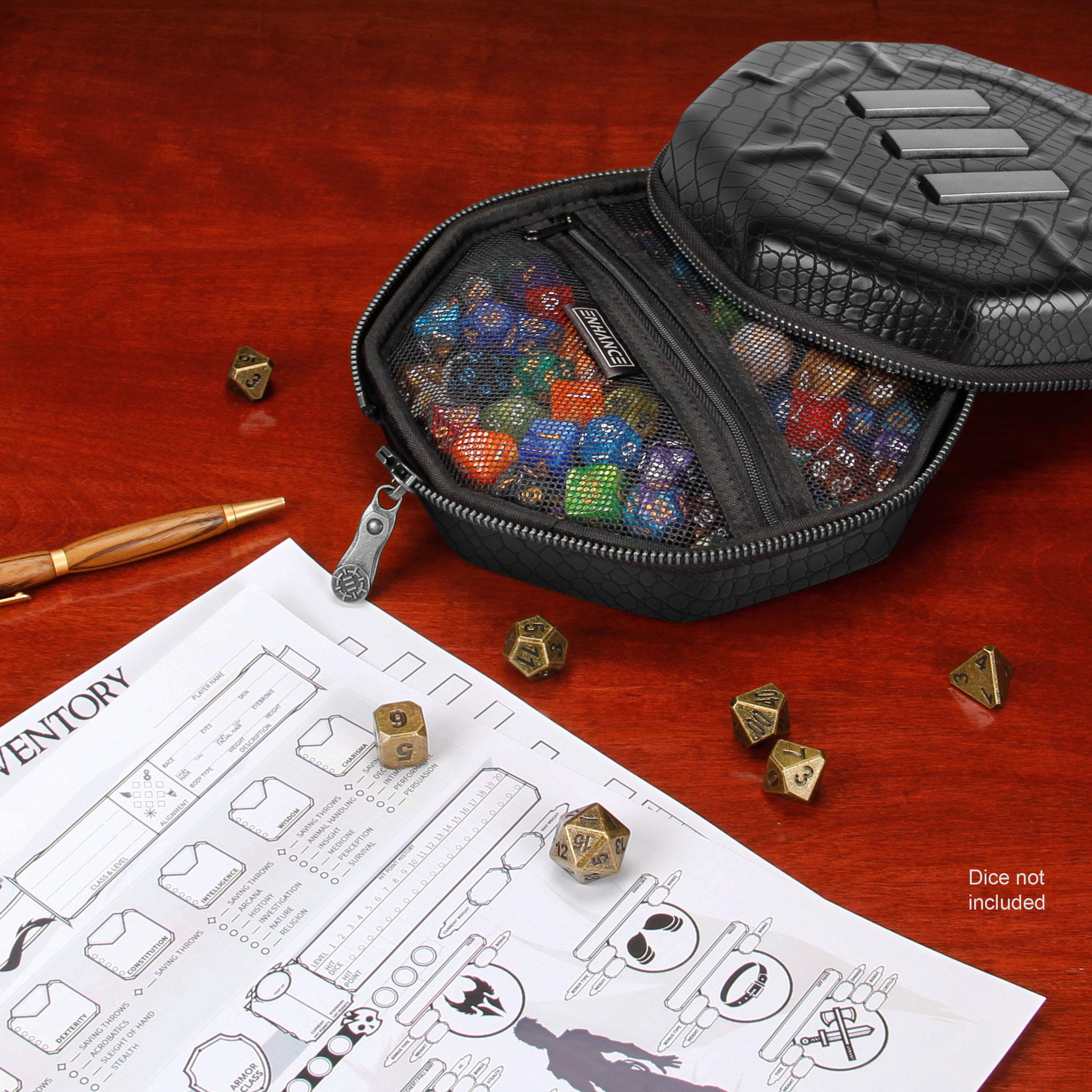 Protect and store your treasure horde of gaming dice in the ENHANCE Collector's Edition Dice Storage Case. Beautifully designed with our exclusive "Dragon Hide" exterior and stylish gunmetal accents, the Dice Storage Case is the perfect addition to your collection of RPG travel accessories. The ENHANCE Dice Storage Case is actually two products in one, with one half safely storing upwards of 150 dice and the other functioning as a large dice tray that can be passed around the gaming table or held onto for personal use. A hard shell reinforced case protects your dice from wear and tear, while the soft lined interior keeps all your dice free from blemishes and unsightly scratches.
