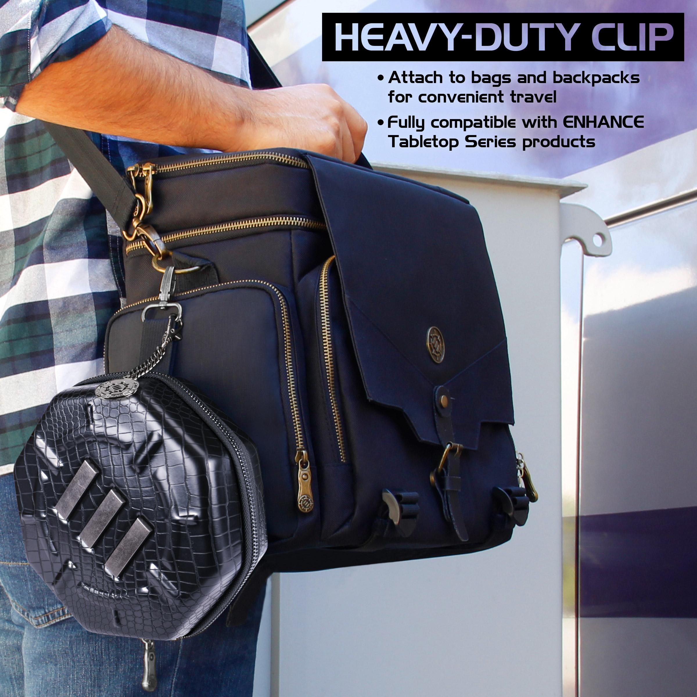 Your metal dice and unique dice sets will find a permanent and protective home within the ENHANCE Dice Storage Vault. It also features a metal attachment clip for attaching to backpacks and bags, which is fully designed to work with the ENHANCE Adventurer's Bag, the ENHANCE Miniature Figure Carrying Case, and the ENHANCE MTG Card Carrying Case. Our Dice Travel Case is great for Dungeons and Dragons, board games, and various other tabletop RPG games including Pathfinder, Runequest, GURPS, Savage Worlds, and many more. Replace your small dnd dice bags and bulky dice trays with the ENHANCE Dice Case, a solution for all RPG players.