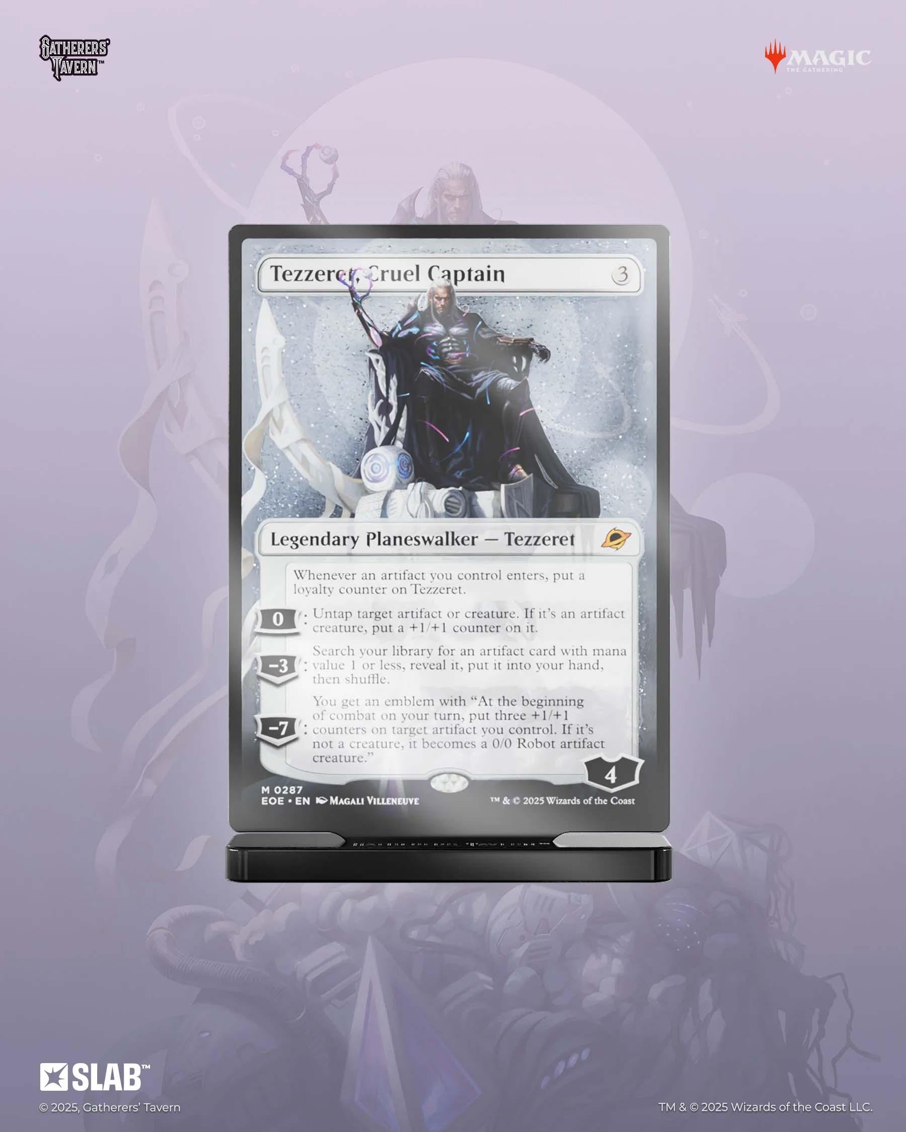 "Behold, the Metalman cometh; present yourself to him, or he'll present you. Featuring Magali Villeneuve's Borderless Triumphant art for Edge of Eternities, find a twisted saviour among the stars in this Tezzeret, Cruel Captain Slab standee.Product Details:Acrylic stand containing liquid glitter that flows as you turn it aroundDimensions:Card: 8cm x 11cm x 0.8cm