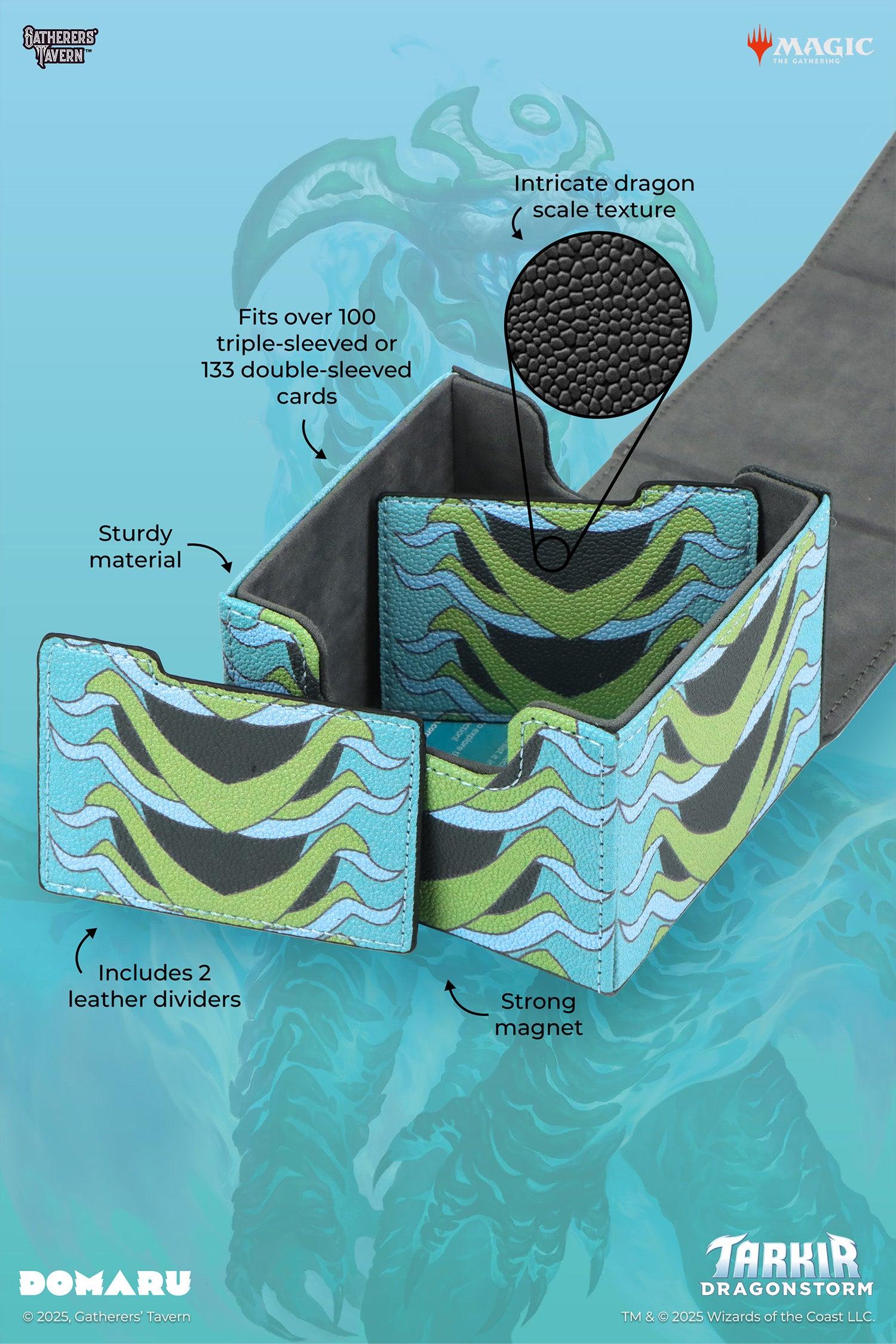 Tarkir: Dragonstorm Inspired Design: Featuring textured scale patterns of the five dragons, the Tarkir: Dragonstorm DOMARU Box is the perfect way to showcase your love for the set.