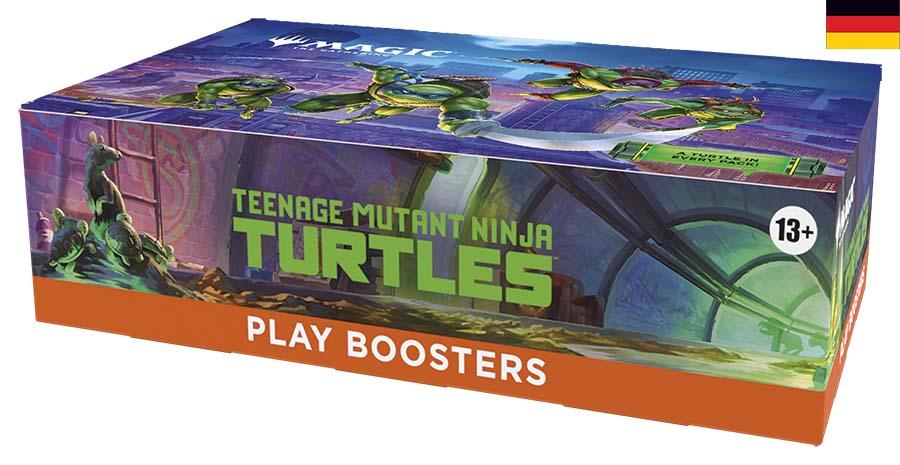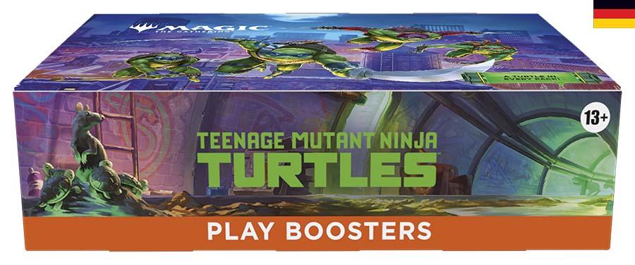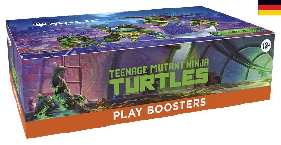 Jeder Magic: The Gathering - Teenage Mutant Ninja Turtles Play-Booster enthält 1–5 Karten der Seltenheit selten oder höher (2: 25 %, 3: 3 %, 4–5: < 1 %), 2–5 nicht ganz so häufige, 6–10 häufige und 1 Länderkarte. 1 Karte beliebiger Seltenheit ist eine traditionelle Foilkarte. Sagenhaft seltene randlose Turtle-Foilkarte in < 1 % der Booster. In 20 % der Booster ist statt der Länderkarte ein traditionelles Foil-Land enthalten.