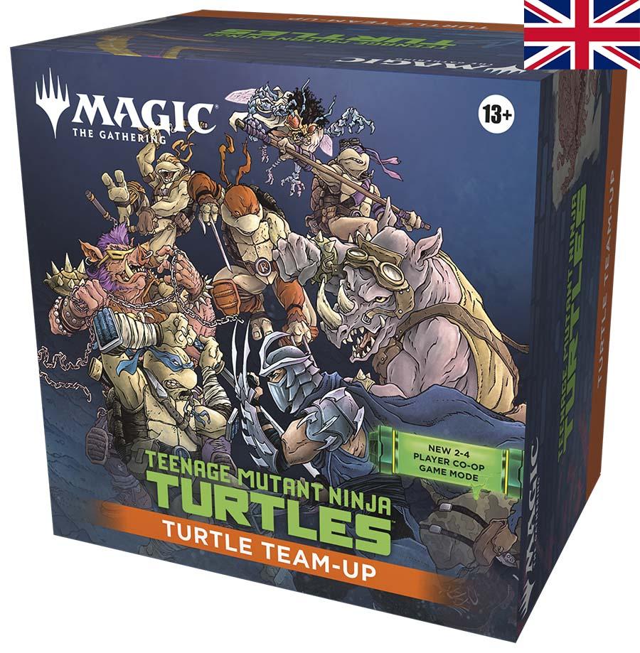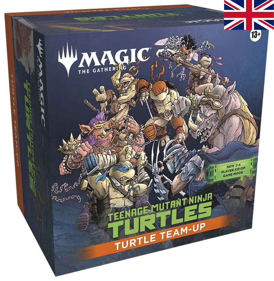 When the evil Shredder attacks, Turtles fight back! In this exciting new co-operative strategy format for Magic: The Gathering, two-to-four players battle for survival against an onslaught of villainous adversaries. Play with your favorite of the four pre-built 60-card hero decks, then crack into the included Play Boosters to expand your strategies. Plus, its the perfect training dojo for Magic players of any skill level to come together and play! Turtle Team-Up includes four 60-card Magic decks, one Enemy deck with 11 bosses, seventeen Event Cards, and four 14-card Magic: The Gathering - Teenage Mutant Ninja Turtles Play Boosters.