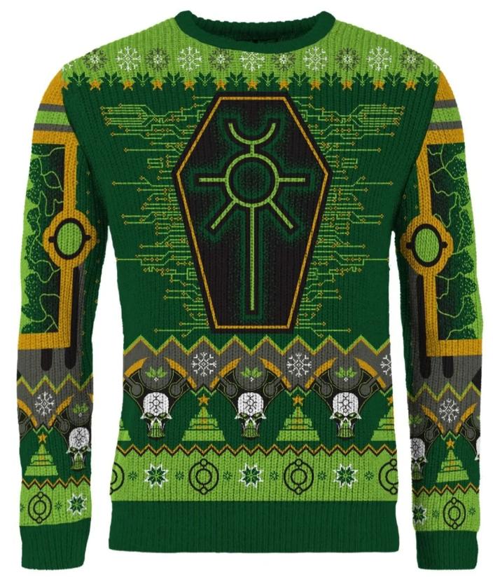 "Die Necrons sind berühmt für ihre 60 Millionen Jahre dauernde Hibernation, und wenn ""Der große Schlaf"" wie eine Beschreibung für deinen Mittagsschlaf nach dem Weihnachtsessen klingt, dann ist dieser Necron-Weihnachtspullover definitiv das Richtige für dich. Dieser Pullover ist wunderschön in festlichem Grün und Gold gestaltet, mit einem herausragenden Ankh des Triarchen auf der Brust, umgeben von komplizierten Necron-Schaltkreisen. Die Ärmel und der Saum sind mit Schneeflocken und Necron-Bildern wie dem Symbol des Chronomanten übersät. Alle unsere Weihnachtspullover sind zu 100% gestrickt, niemals bedruckt. Sie bestehen aus synthetischen Materialien wie Acryl, was bedeutet, dass sie großartig für Veganer und Menschen sind, die von natürlicher Wolle irritiert sind."