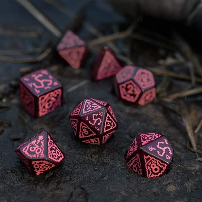 The one who listens. Witness the dice set inspired by The Witcher franchise, dedicated to the Whispess — who listened to all that occurred in the swamp. The set contains 7 dice and a metal coin. Each dice is painted shimmering-red with pink engravings. The highest value faces and the coin reverse share imagery with the ominous sigil marking; the three crones rule over the obverse.