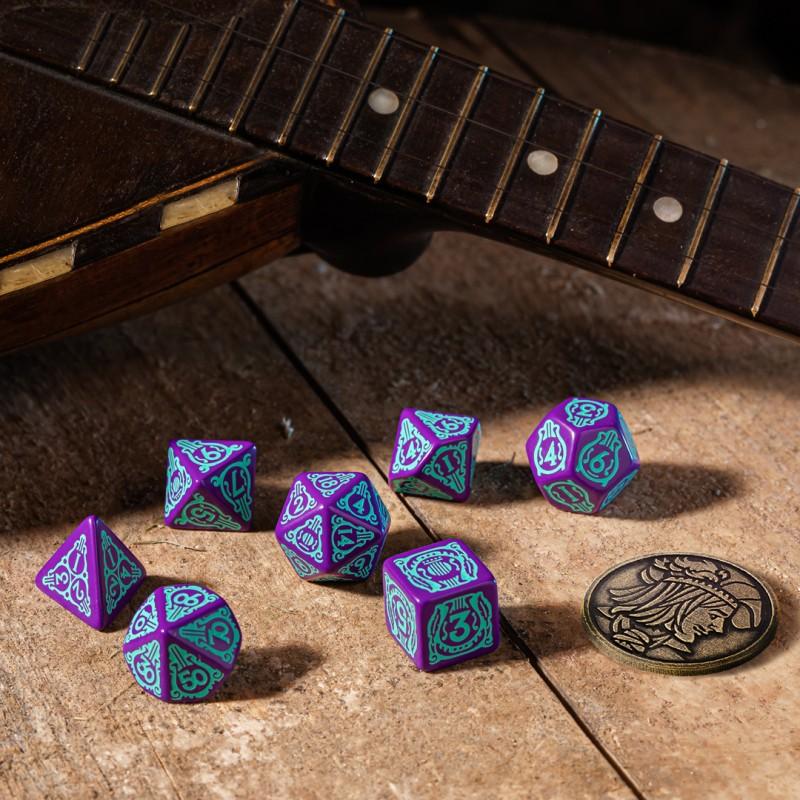 World-famous poet. Inspired by The Witcher franchise, this dice set is dedicated to Dandelion — a troubadour known for his stirring ballads. The set contains 8 pieces; 7 polyhedral dice, and a metal coin featuring Dandelion’s depiction, which acts as a D2. Each die is painted purple with turquoise engravings. The highest value faces and coin reverse display Dandelion's favored lute.
