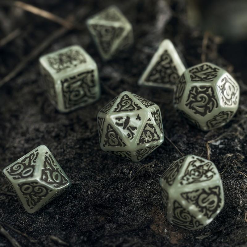 A sign of danger. Witness the dice set inspired by The Witcher franchise and dedicated to the leshen — a monster marking its territory with totems giving it power. The set contains 7 polyhedral dice and a metal coin. Each dice is painted pearly-green with brown engravings. The highest value faces and the coin reverse share imagery with the leshen's horned skull; the crows rule over the obverse.