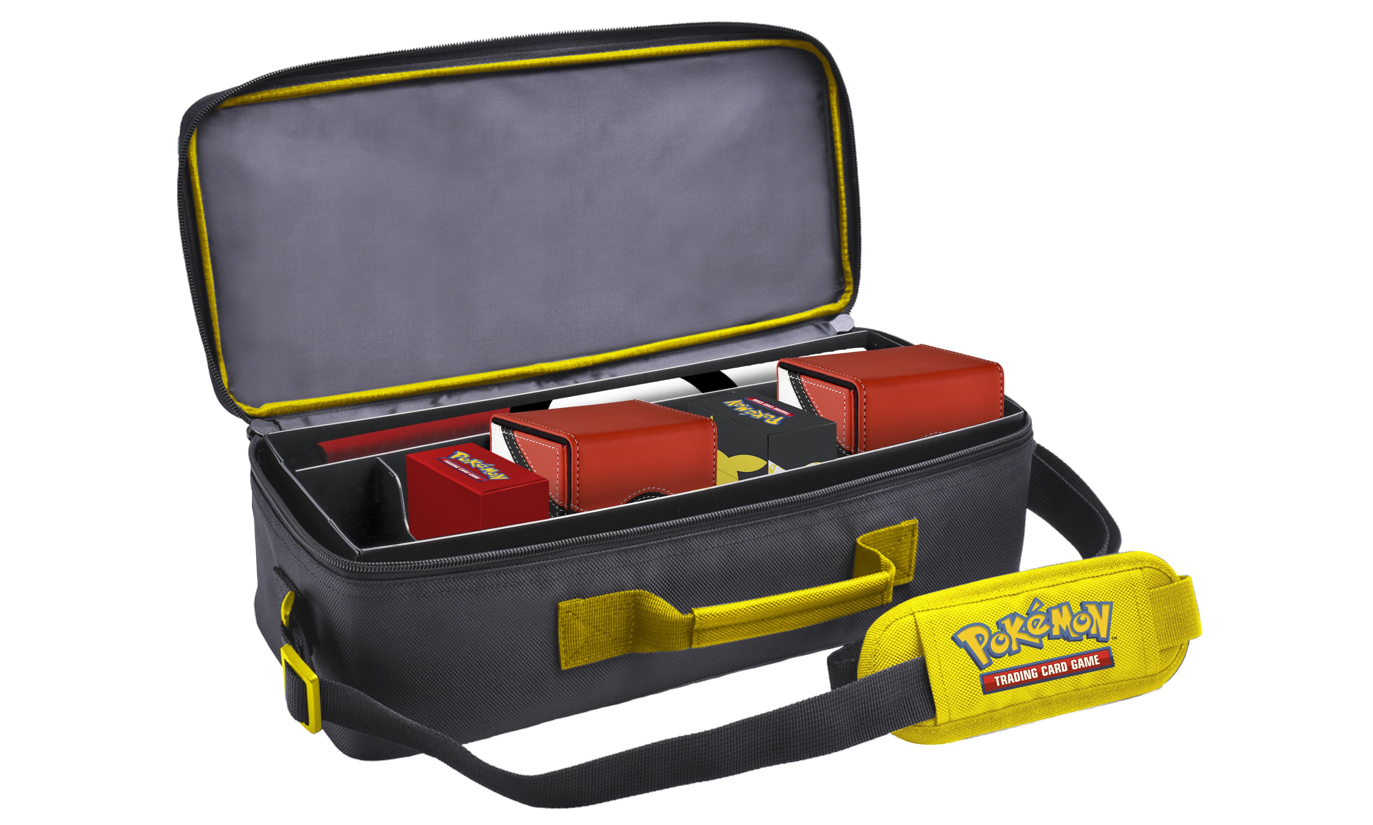 The Pikachu Deluxe Gaming Trove by Ultra PRO features vibrant artwork and maximum utility for every Pokémon Trading Card Game player or collector! The adjustable padded shoulder strap extends to up to 60 in. with a briefcase handle option. The Deluxe Gaming Trove provides customizable storage in a durable fabric shell. Each case includes five modular inserts and is specifically designed to store a playmat and several Ultra PRO Deck Boxes. In addition to the iconic Pokémon artwork, the custom zipper pull tab features the Electric Energy symbol. The Pikachu Deluxe Gaming Trove is the ultimate Pokémon TCG companion. Officially licensed Pokémon Trading Card Game carrying case featuring Pikachu Durable fabric shell features iconic Pokémon artwork Adjustable strap (up to 60 in.) and modular inserts (5) for customized comfort and storage 15 in. horizontal design perfectly stores a playmat and several Ultra PRO Deck Boxes Zipper pull tab features the Electric energy symbol