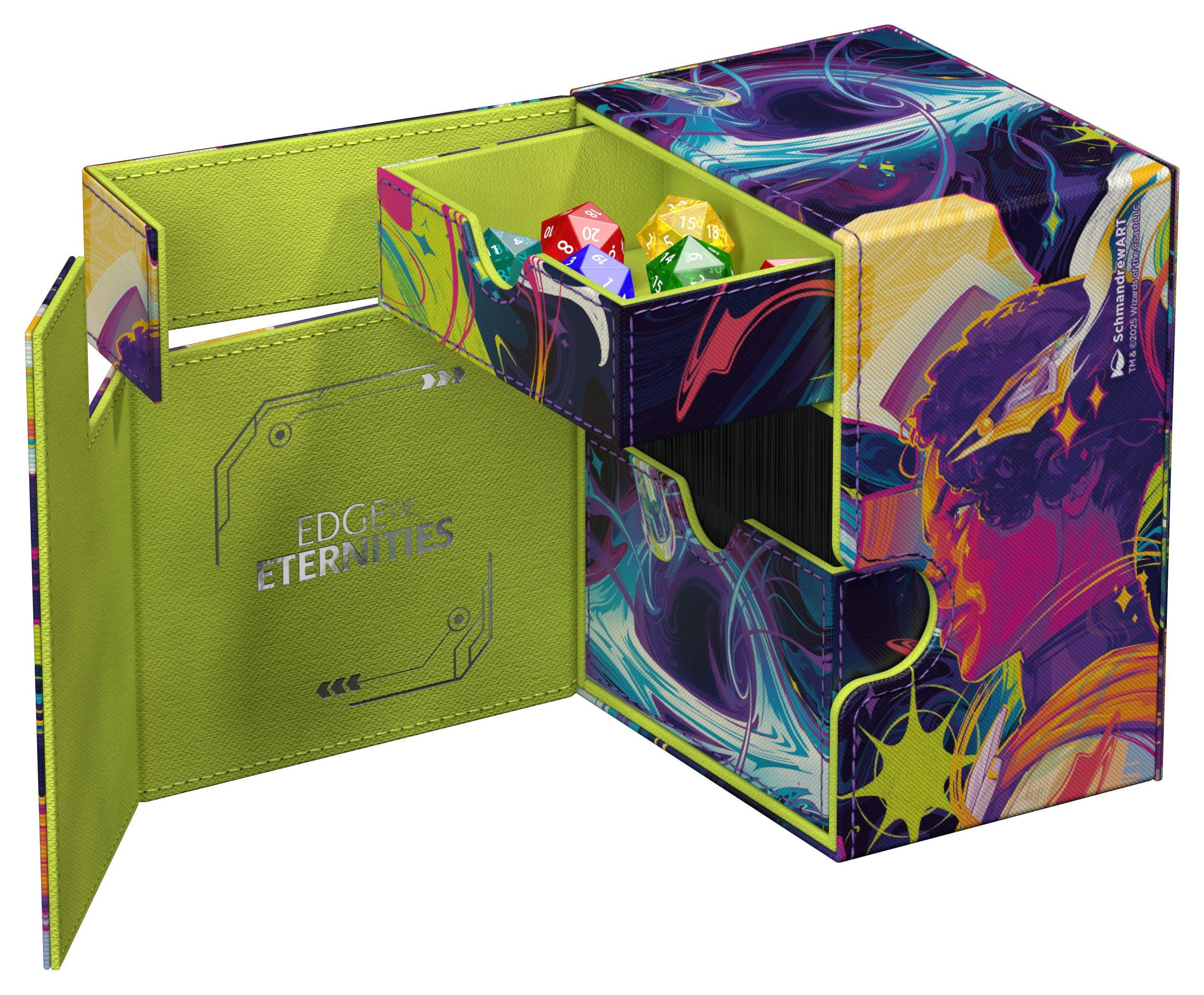 Ultimate Guards Flip'n'Tray 133+ Xenoskin mit offiziell lizenziertem Artwork aus Magic: The Gatherings Edge of Eternities -Set aus vollfarbig bedrucktem, widerstandsfähigem Xenoskin-Material bietet nicht nur Platz für 133 doppelt gesleevete Karten in Ultimate Guard-Hüllen, sondern auch ein integriertes und herausnehmbares Würfel-Fach. Der Flip'n'Tray 133+ Xenoskin ist die perfekte Deck-Box für Commander/EDH-Decks und verfügt über zuverlässige und starke Magnetverschlüsse für die sichere Aufbewahrung von Karten und Zubehör.