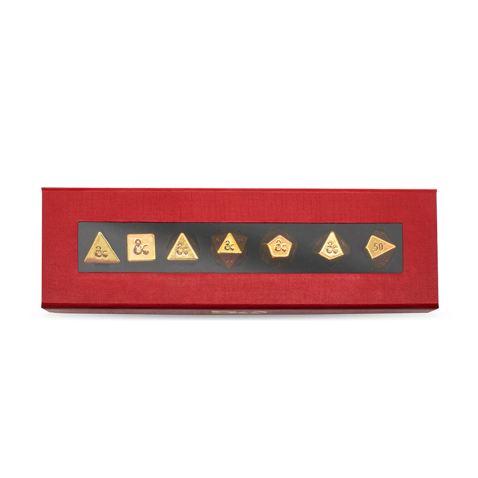 Ward off enemies on your next adventure with the commanding roll of these official golden Dungeons & Dragons 50th Anniversary Heavy Metal dice! Made from the same heavy, zinc alloy material as the Heavy Metal D20 sets, rolling these dice will send a rumble through the realm! The set includes one each: D4, D6, D8, D10, D12, D20, and a Percentile Die - all the dice you need for your next D&D adventure!