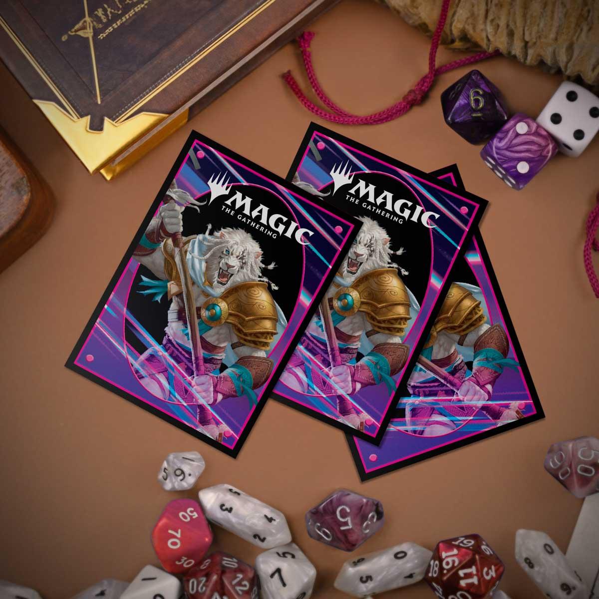 The 100ct Deck Protector sleeves for Magic: The Gathering feature full-color artwork and are made with our proprietary ChromaFusion Technology to prevent peeling. Archival-safe polypropylene materials ensure you can sleeve your cards with confidence. Sized for standard size trading cards measuring 2.5 in. x 3.5 in. The matte finish offers a glare-free, camera ready play experience!