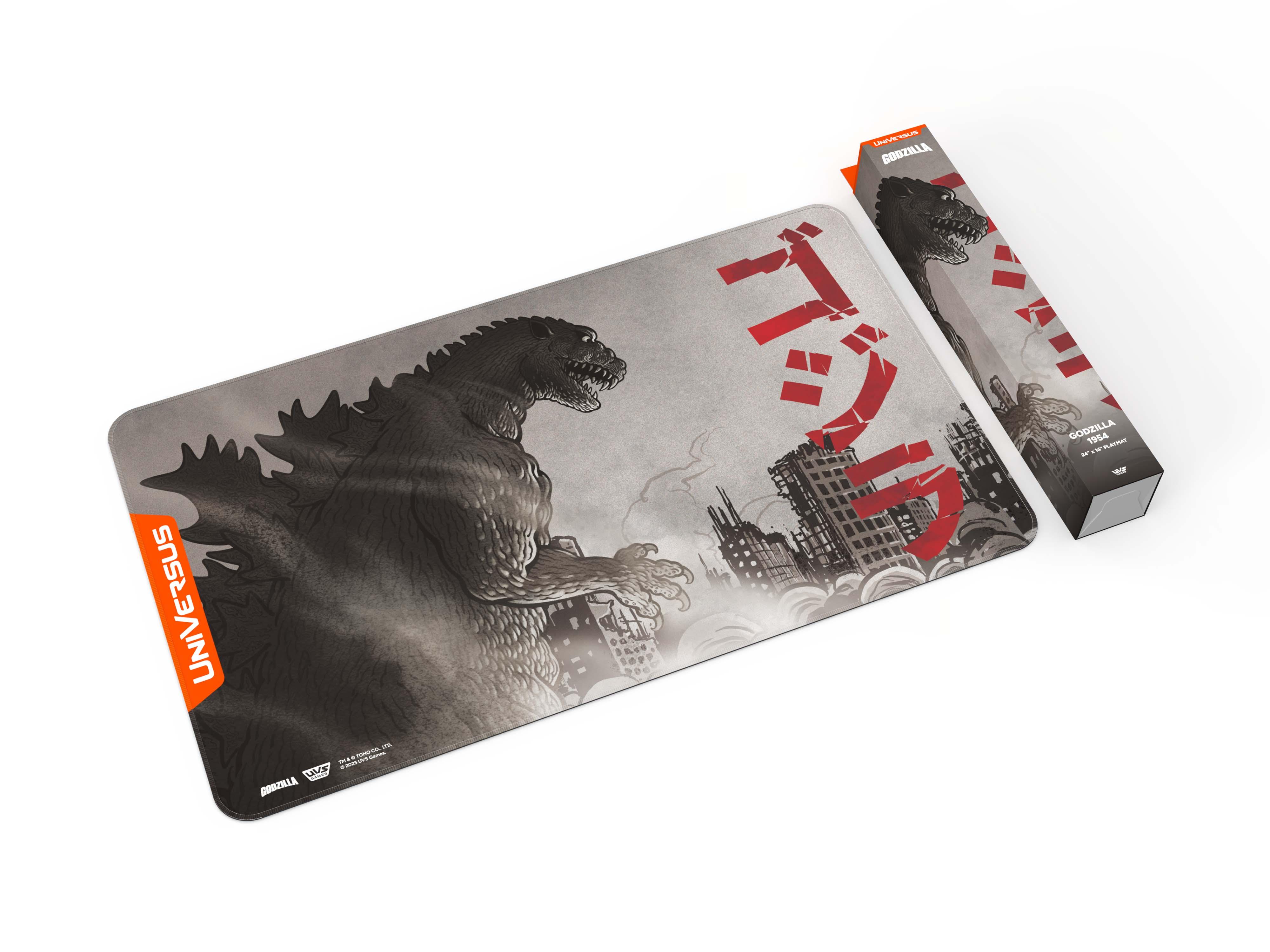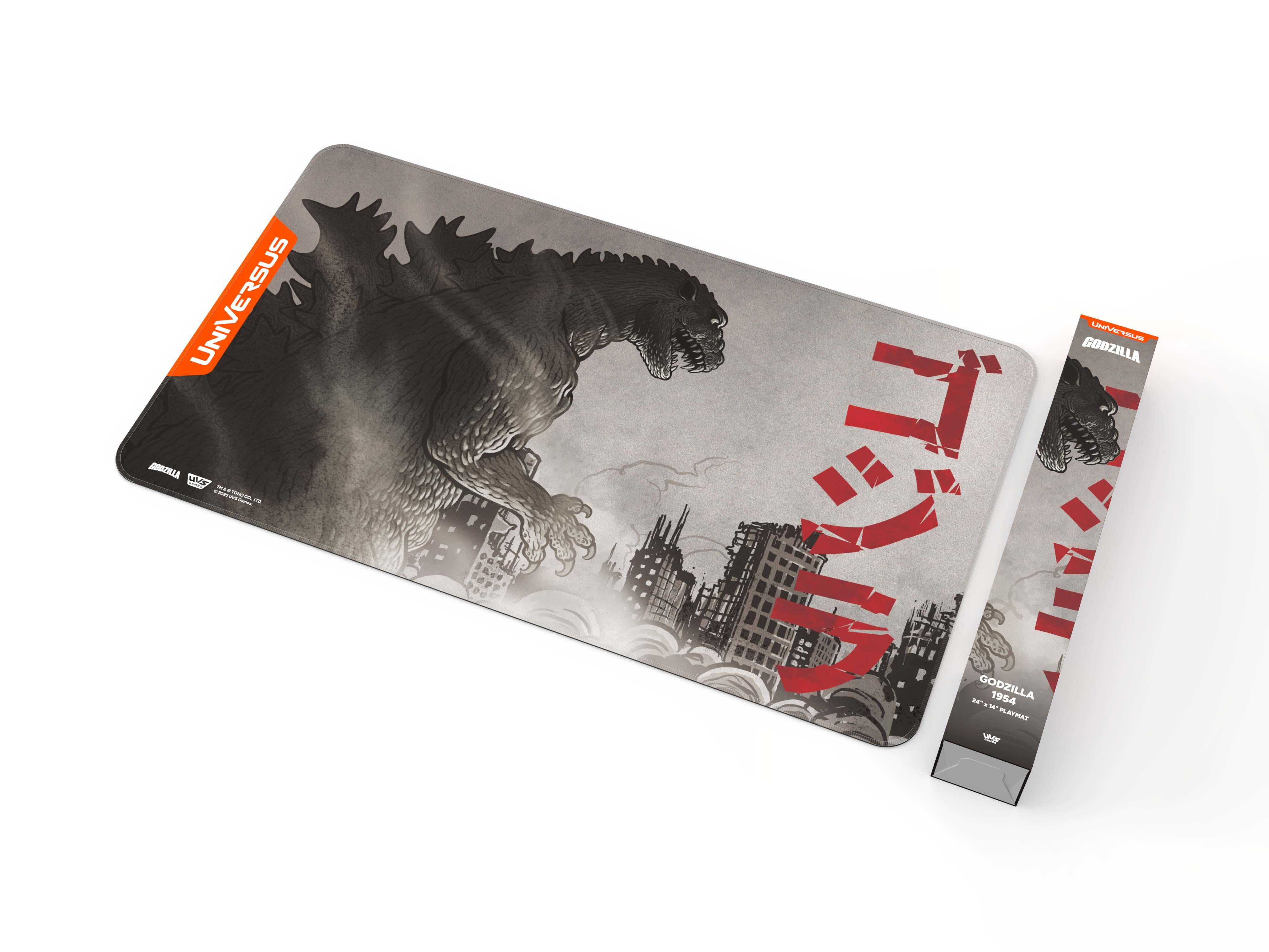 The King of the Monsters makes his return to UniVersus! Keep your cards safe and show them off in style with this brand new playmat featuring Godzilla 1954 from the Godzilla: Reign of Kaiju UniVersus release.? Updated packaging in a box suitable for hanging or shelf displays? High quality 24 x 14 inch neoprene playmat with stitched trim? Smooth surface with rubber backing to keep the mat from slipping? Exclusive designs featuring your favorite Godzilla characters from the Reign of Kaiju UniVersus release!? One of 4 different playmats created for the release of Godzilla: Reign of Kaiju!