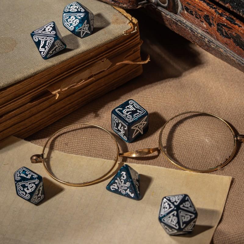 We at Q Workshop are tirelessly working to create a design that can mesmerize your eyes and softly graze your imagination with a spark of twisted curiosity to dive deeper into the Lovecraftian mythos with the help of the official Call of Cthulhu Dice Set. Many designs have seen the light of day since, and this is one of them.