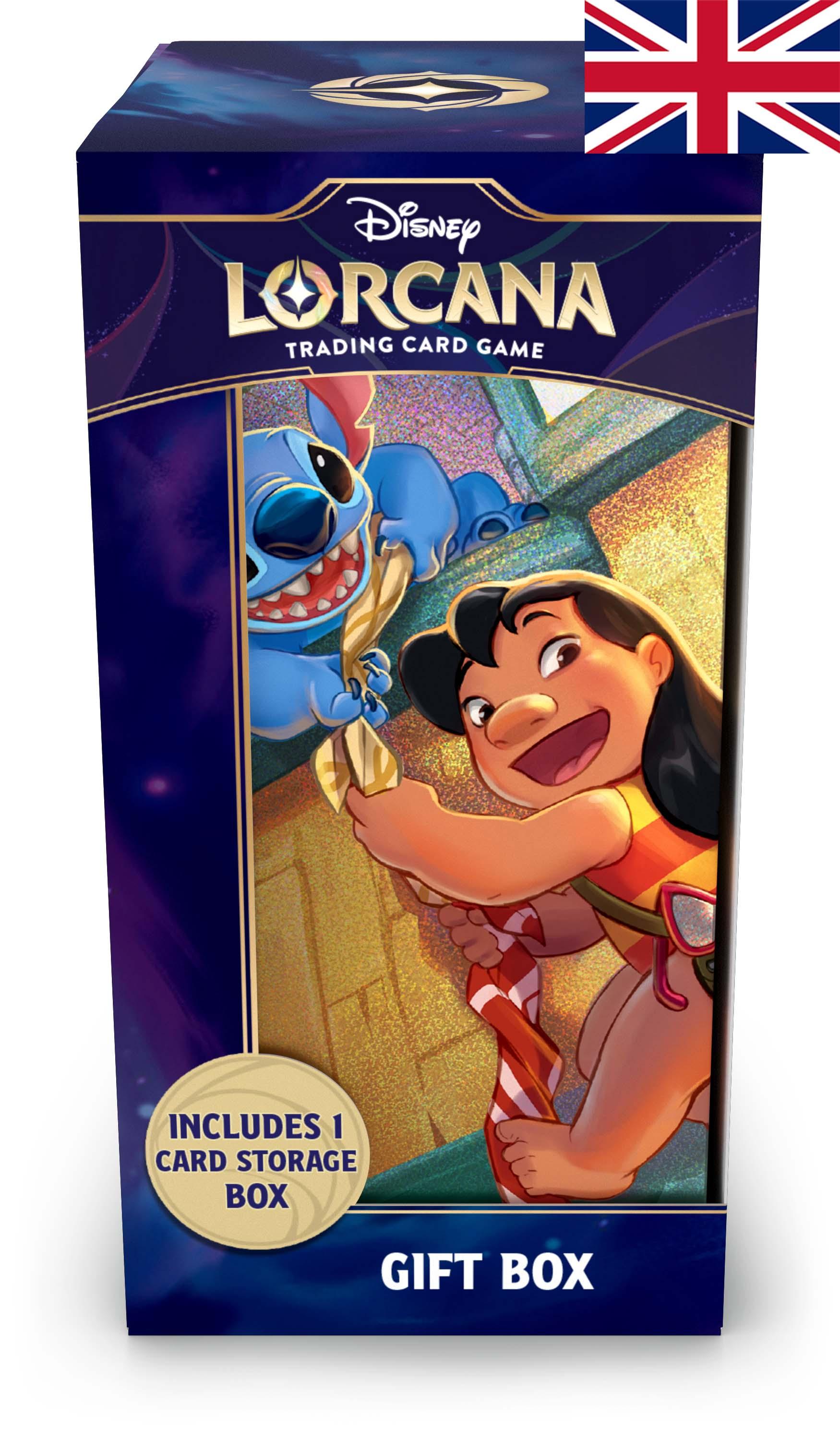 This Disney Lorcana gift box includes a unique foil card featuring brand-new Lilo artwork and a selection of booster packs with a total of 60 cards from various Disney Lorcana TCG sets. Everything is stored in an illustrated storage box that can securely hold up to 250 sleeved cards.