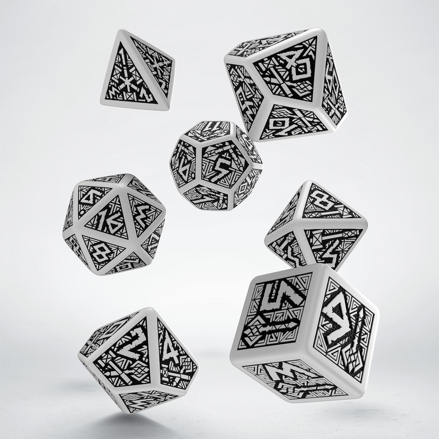 The white set with black engravings is a set inspired by the Freyja’s necklace, Brisingamen. It's just a jewellery masterpiece, but its glow is more beautiful than the light of the aurora borealis. It allows to light up any darkness and hides the wearer with its lustre. Thanks to it Thor, dressed as a woman, regained Mjöllnir from the giants. Such a patronage bodes well for the users of these dice. They will be like the glow of the aurora that will allow you to overcome the darkness.
