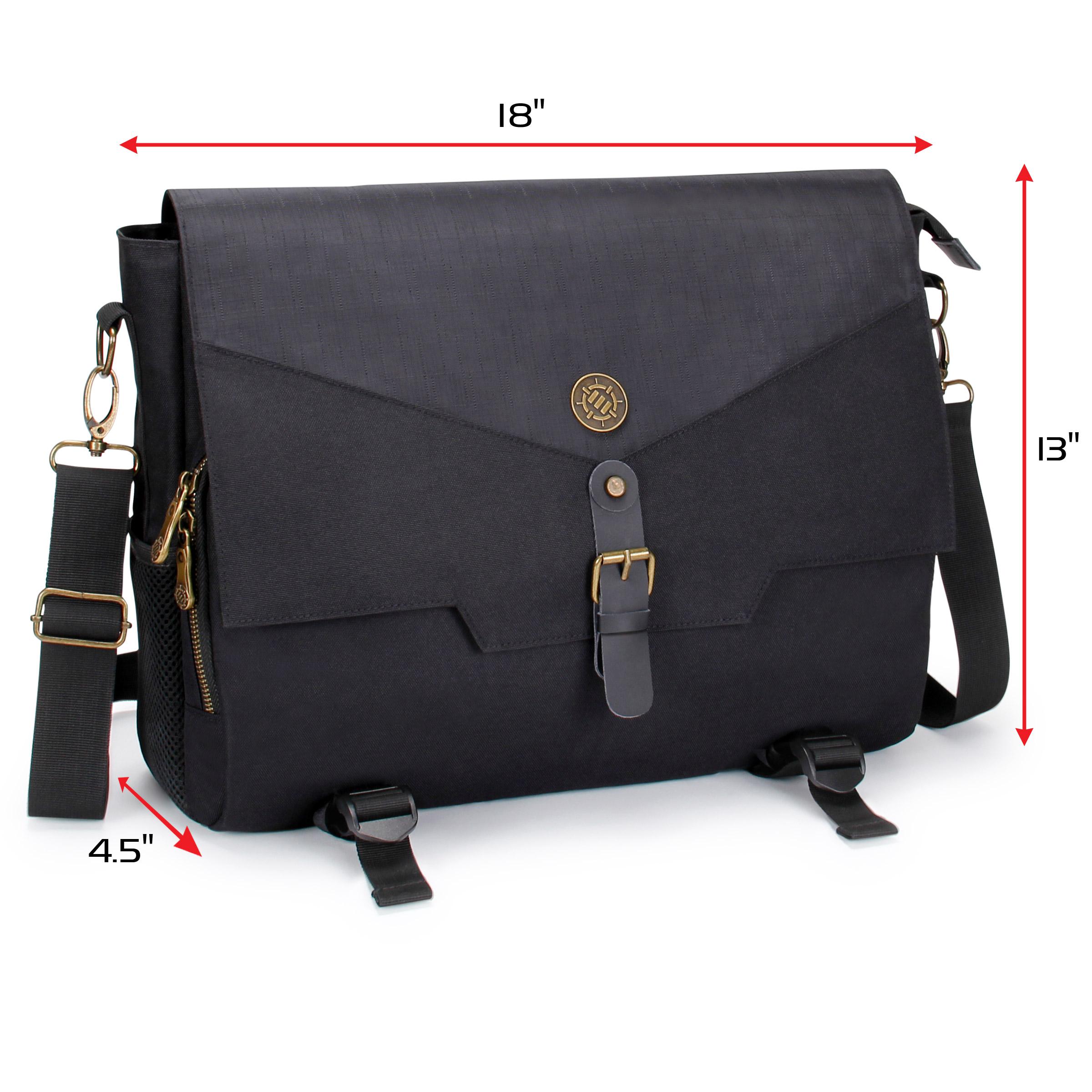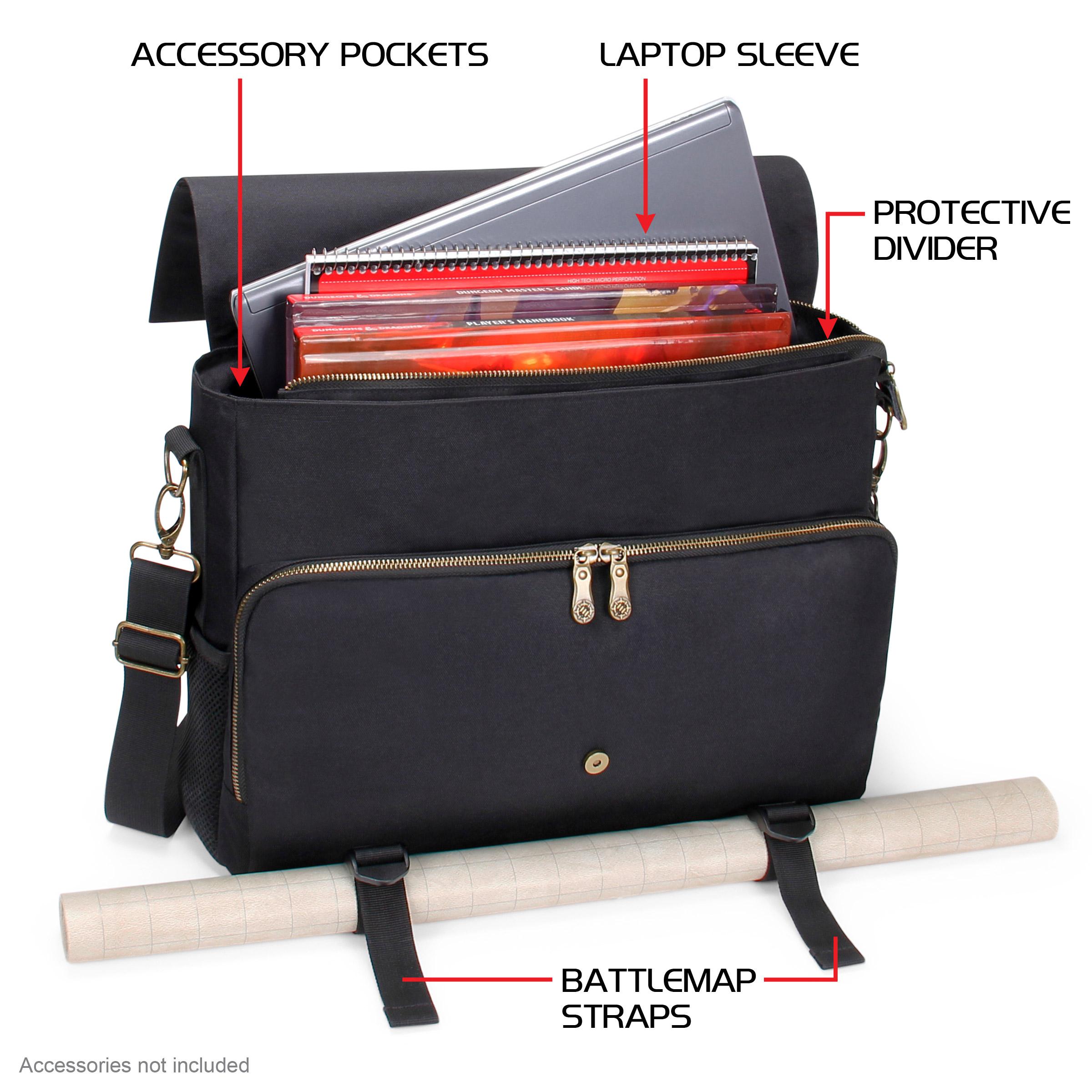 The messenger bag style design offers incredible versatility and comfort. The familiar design is comfortable to wear even throughout long days on campus, at work, or at conventions. The interior features a thick padded divider to help organize your character's gear and includes enough space for up to 4 rulebooks, or a combination of binders, journals, folios, and more. Opposite of the divider is a special compartment with an elastic security strap designed to hold laptops and tablets in place during travel. The compartment accommodates up to 17 inch laptops, but can also store smaller devices or additional books and binders.