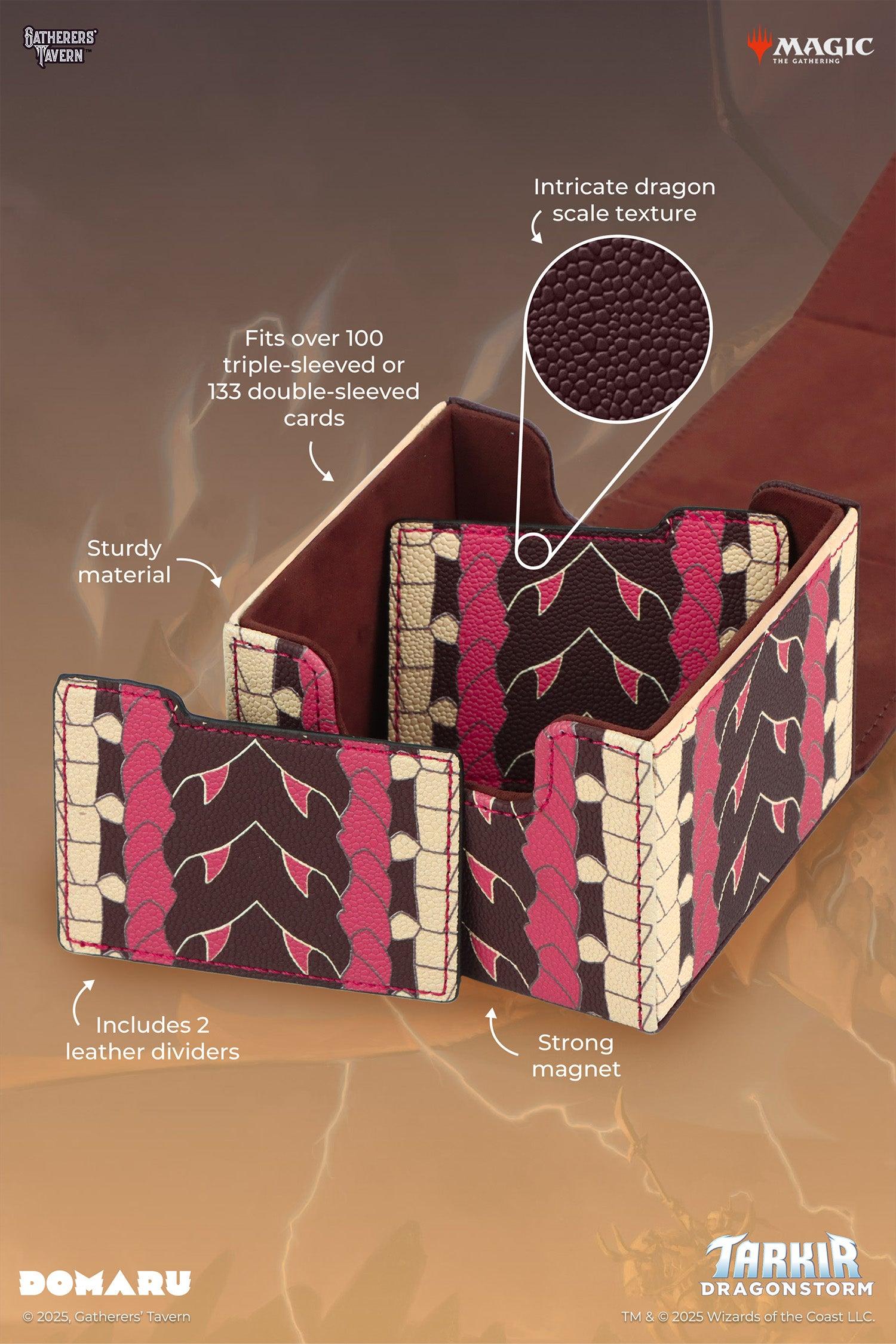 Tarkir: Dragonstorm Inspired Design: Featuring textured scale patterns of the five dragons, the Tarkir: Dragonstorm DOMARU Box is the perfect way to showcase your love for the set.