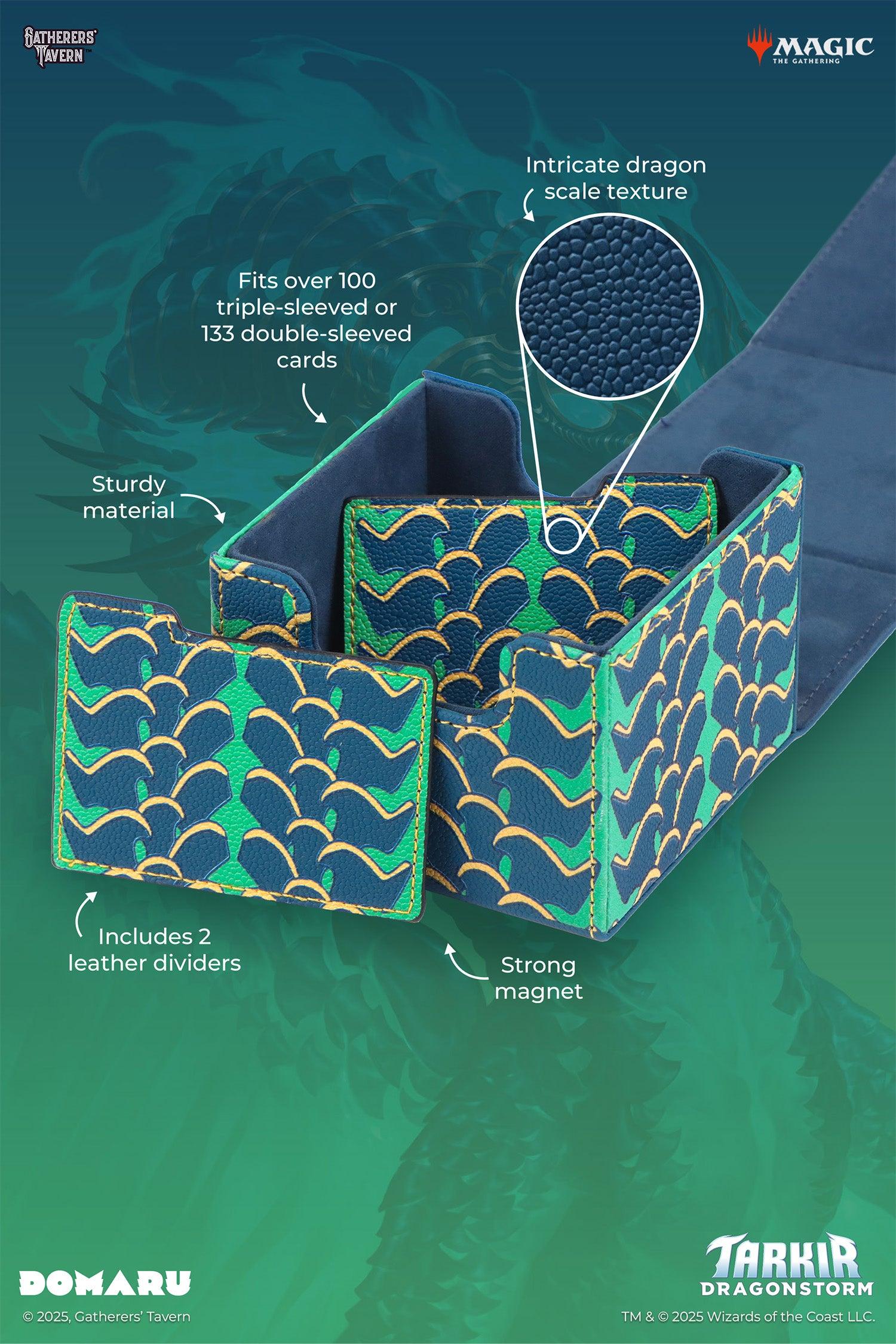 Tarkir: Dragonstorm Inspired Design: Featuring textured scale patterns of the five dragons, the Tarkir: Dragonstorm DOMARU Box is the perfect way to showcase your love for the set.