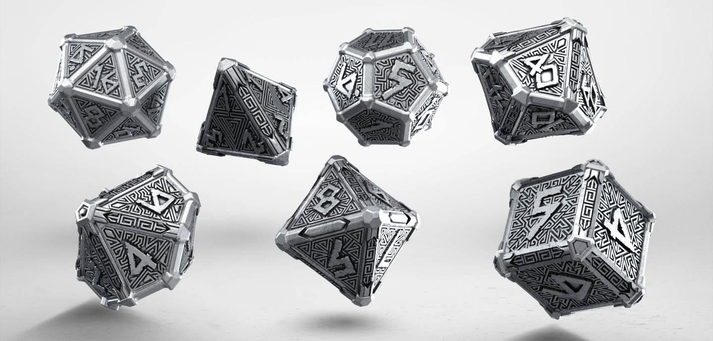 There was the time of myths. the real golden age of all epic stories. All games should make us remember these beautiful day dreams, and tales about brave heroes, monsters, magical artifacts and journeys beyond the known horizon. One from the symbols of mythic age was Daedalus, father of a suicide romantic, the inventor of robots, the goddesses garden’s designer and the builder of Labyrinth, the most expensive and sophisticated cowshed for a son of a bull. Q WORKSHOP presents the unique Metal Mythical Dice Set. The patron of this set full of polyhedral metal dice, made of tin, is mythic Daedalus himself. We decorated the mastercrafted dice with engraved stylized Greek numbers and covered with small Labyrinths, symbols of Daedalus masterwork. Each die is adorned with sculpted geometric borders on the edges and pentagons in the corners. We supported the heights of crafts in this set because the first time we feel so great need to honor the great inventor with the best design. Dedalus was really genius, so our dice shouldn’t be the disappointment.