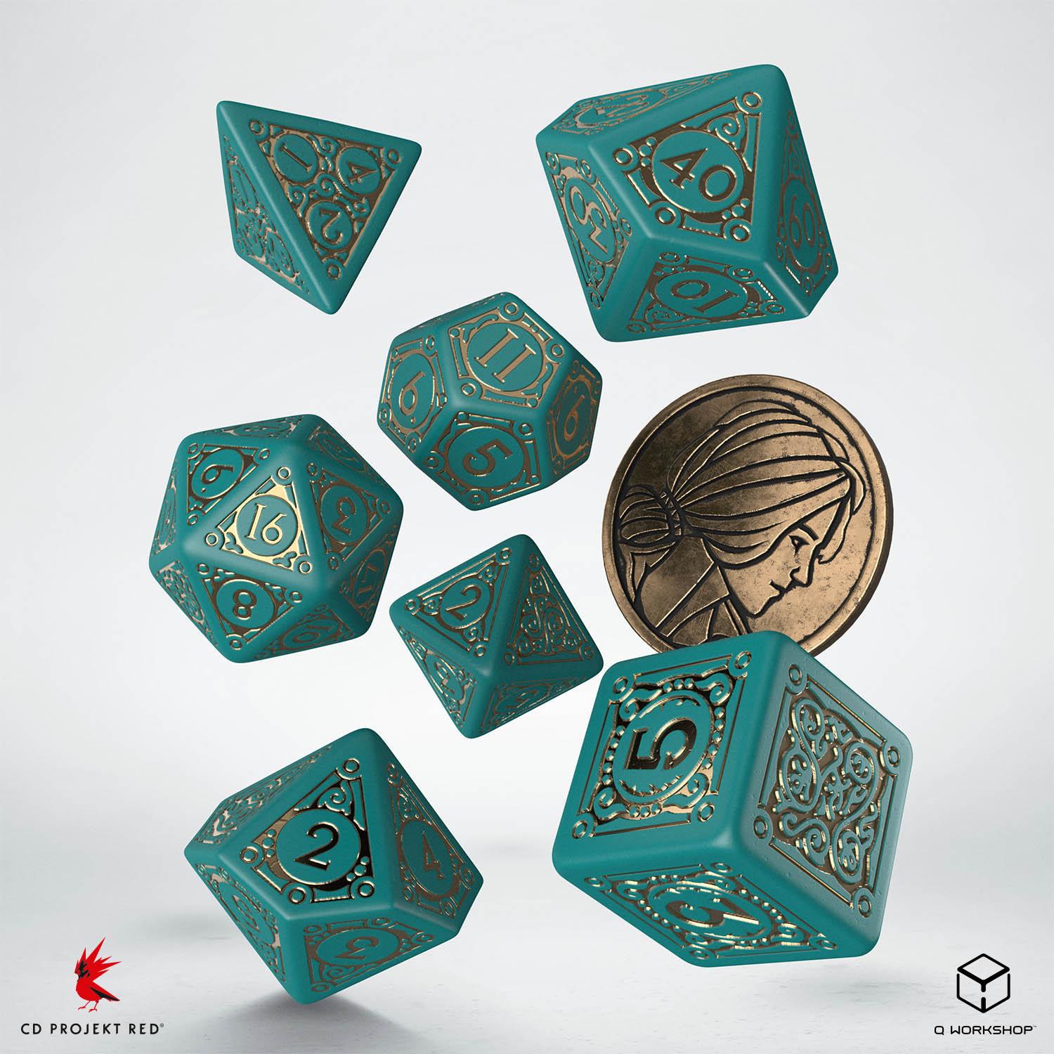 This is who this special dice set in a turquoise and gold color theme is dedicated to, carrying a clear font of digits, intricate engravings, and the sorceress’ medallion decorating the highest faces. The coin featured in the set also shows this symbol on the reverse, while the obverse is adorned by the side-profile of Triss’ gentle face.