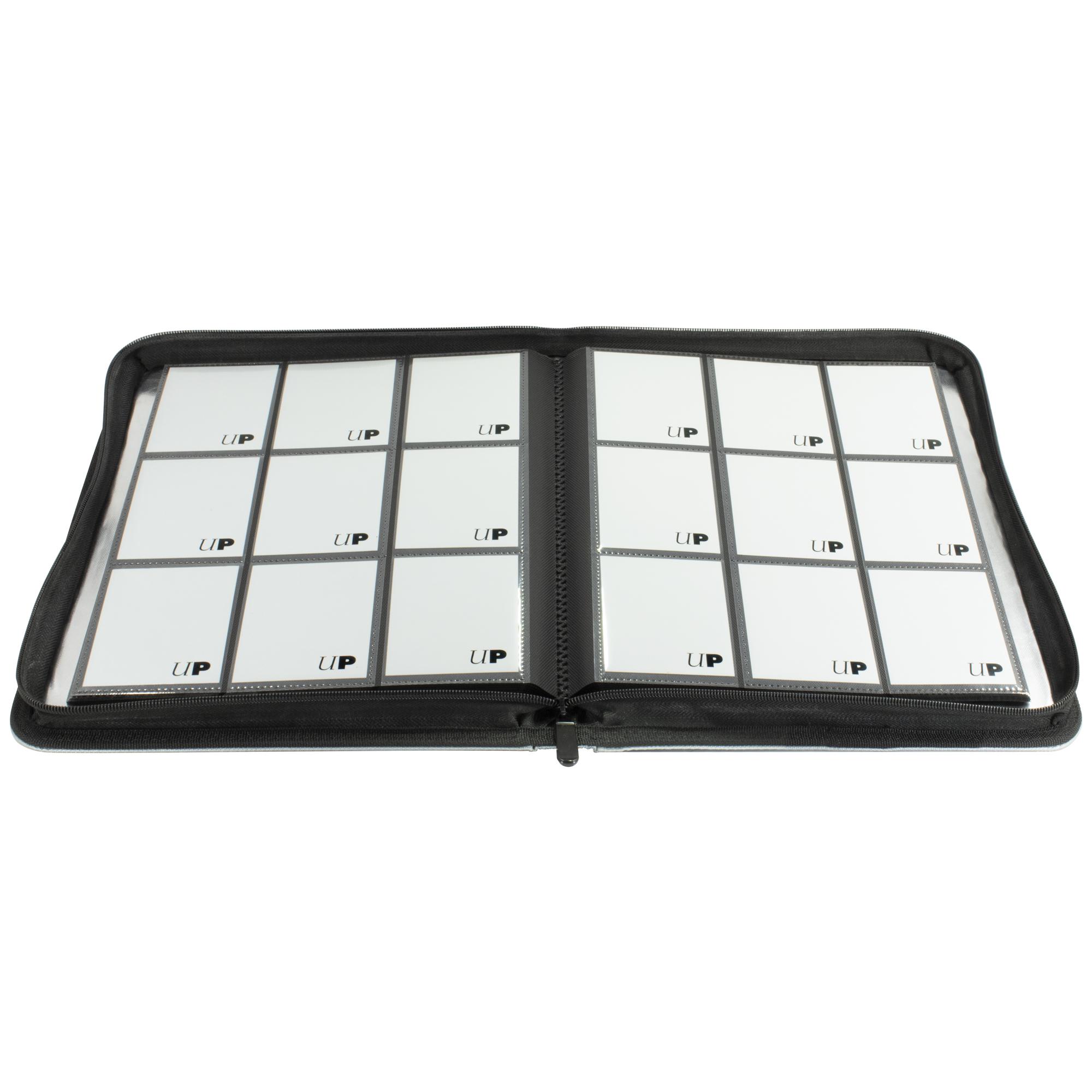 Ultra PRO 9-Pocket Zippered PRO-Binders are designed for collecting and organizing your favorite trading cards. Each binder features a padded exterior cover made with fire resistant materials with matching zipper closure and pull tab. After unzipping the binder, youll find twenty 9-pocket pages sized for standard trading cards in side-loading pockets, allowing you to store up to 360 cards in Deck Protector sleeves. Pages feature a low-friction black backing, creating a separation between the front and back pockets as well as providing cards a classic framed look, and are made with acid-free, non-PVC materials to ensure your cards are protected and preserved.