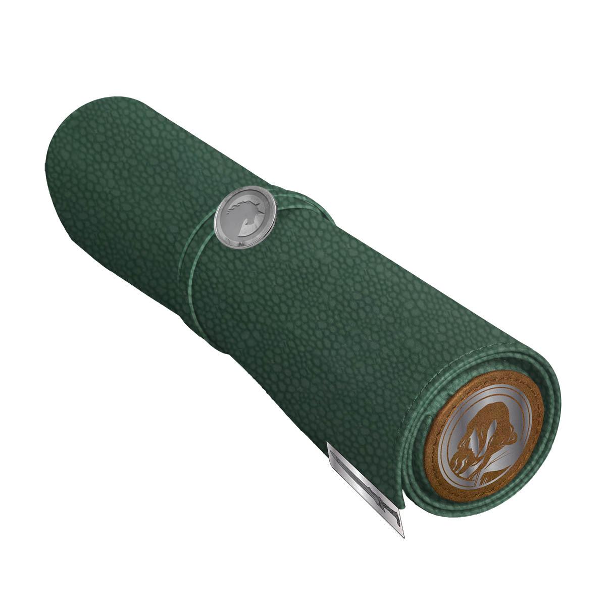 The Premium Dice Scroll Map offers storage and also functions as a dice rolling mat. Made with a durable Sage Green and Brown pebbled leatherette exterior and soft suede original Forgotten Realms cartography interior by Deven Rue, your favorite dice will be stored safely and your table protected when rolling on this soft roll-out mat. The zippered compartment holds 20+ dice on average, rolling mat furls into a scroll around the zippered compartment, and is easily secured shut with a snap closure. With beautiful silver metal and foil accents, this Premium Dice Scroll Map will be great for your next role-playing game, D&D session, or cosplay!