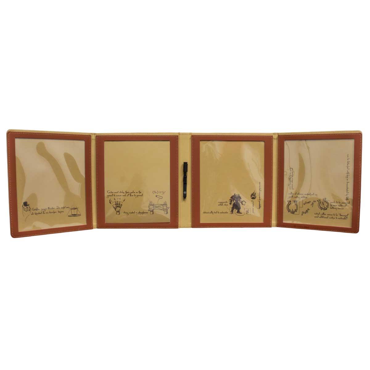Master your campaign like a true wizard with the Game Master Spell Book, a multi-use table screen inspired by Caleb Widogast?s own book of spells from Critical Role?s Mighty Nein! Bursting with thoughtful details, this premium leatherette tri-fold screen pays homage to Campaign 2?s most methodical and magic-loving wizard Caleb Widogast, with special bronze foil designs of the Critical Role logo, Caleb?s past animal familiars, and his beloved furry friend, Frumpkin the cat, rendered beneath a wreath of fiery foil. Frumpkin?s paw prints grace the front and back covers, which feature bronze faux book corners and book straps to create a realistic tomb look. Open this ?well-worn? spell book screen to find even more detail inside: Caleb?s notes, stories, spells, and doodles are scribbled within the bottom interior of each of the four gusseted pocket pages, with secret hidden messages from Jester scattered around the edges in invisible ink that can only be revealed with the right light! Each screen includes four unique pages of static-cling reusable stickers to help you organize your sessions, with character stickers of officially licensed Mighty Nein artwork. Draw maps, plot movement, or take notes directly on the clear, write-on pockets using the included dry-erase marker, and store up to ten A4 or 8.5? x 11? sized paper sheets inside each one, or hold papers outside the pockets using the 8 included initiative tracker clips. A hidden magnetic closure attaches within the tri-fold screen so it folds flush to save space. Measures approximately 42.77? lengthwise when fully opened, with a height of 11.79?.