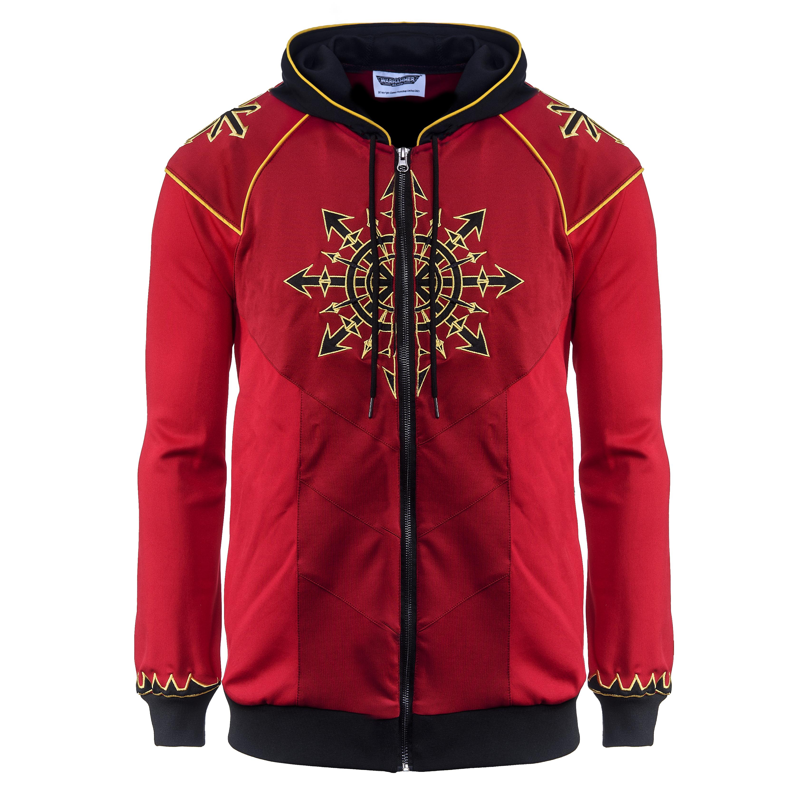 Warhammer 40.000 Kapuzenpullover inspiriert von dem Reich des Chaos. Mit dem Stern des Chaos auf der Brust und dem Symbol der Chaos Space Marines auf jeder Schulter. Hochkontrastiertes Design in Schwarz und Rot mit dezenten gelben Paspeln und goldenen Stickdetails.